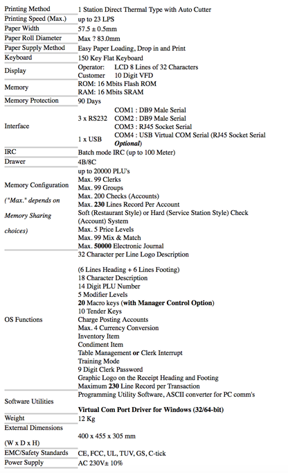 3 x RS232 ports (2 X DB9 Male, 1 x RJ-45 Socket) for Scanner, Scale, PC communication, Kitchen/Bar Printer or Journal Surveillance output, the 4th port is USB Virtual COM port for PC Communication only